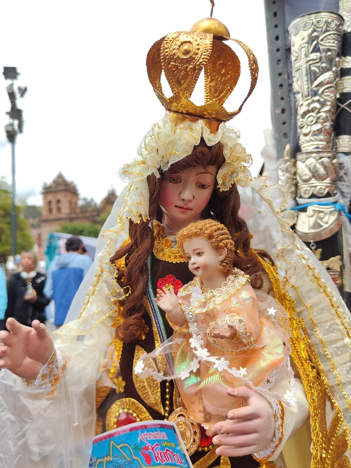 A statue of the Virgin Mary and baby Jesus is showcased. Mary, adorned with a golden crown and ornate, lace-trimmed veil, wears a brown dress embellished with gold embroidery. She holds Jesus, who is clad in a peach-colored garment with white star accents. In the background, blurred figures and buildings are visible, including lamp posts. A colorful, blue box with Spanish text is also present.