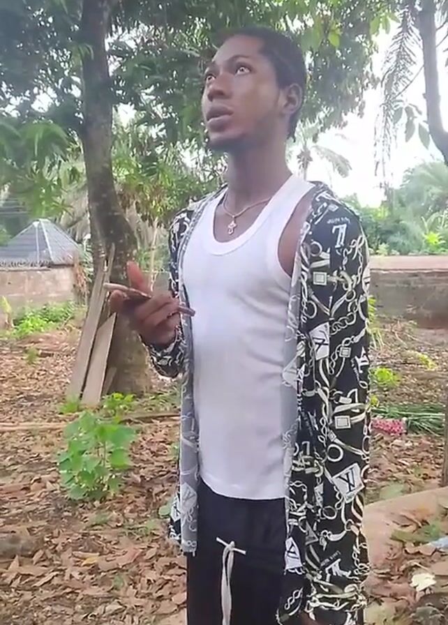 A young man with braided hair stands outside, wearing a white tank top, a patterned black and white open shirt, and black athletic pants. He holds a smartphone in one hand and gestures with the other. The ground is covered in dry leaves, and trees surround him. In the background, there is a small structure with a rounded roof. He is speaking, looking off to the side.