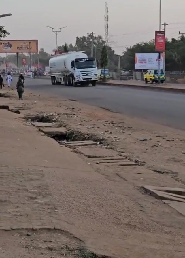 n Eterna-branded tanker truck driving down a road. The road is paved but has a cracked and eroded shoulder. Pedestrians and motorbikes are seen moving along the side of the road. There are billboards and power lines visible in the background. The sky is overcast. The video is taken from a static position on the side of the road, with a pole partially obstructing the view at times.