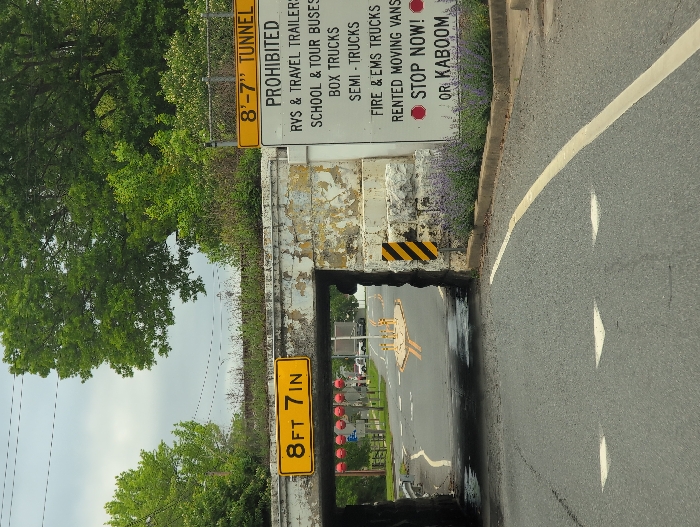 road going under a bridge with a white concrete arch. The bridge is marked with a yellow sign that reads “8'-7” Tunnel Prohibited RVs & Travel Trailers School & Tour Buses Box Trucks Semi Trucks Fire & EMS Trucks Rented Moving Vans Stop Now! Or Kaboom!”. The sign is attached to the bridge, with a yellow and black striped post on its left side. The bridge is covered in vines and has a worn, cracked surface. The bridge also has a second sign, located on the right side of the arch, that reads “8ft 7in” with red reflective lights on it. Three cars can be seen in the distance at the far end of the road, which leads to a crossroad. There is a green grassy area, a road with a yellow line and a white painted line, and flowers growing on the right side of the road. The image was taken at 39.676, -75.774, which is located in the city of Newark, United States.