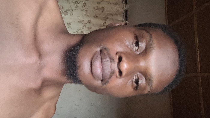 A man with a short, dark beard looks directly at the camera with a neutral expression. He has short, dark hair. His skin is a medium brown tone. The background includes a patterned curtain or wall covering and a wooden structure resembling a cabinet or door frame. The image is slightly rotated, showing the man's bare shoulder and chest on the left side. The lighting is somewhat uneven, creating shadows on his face and body.