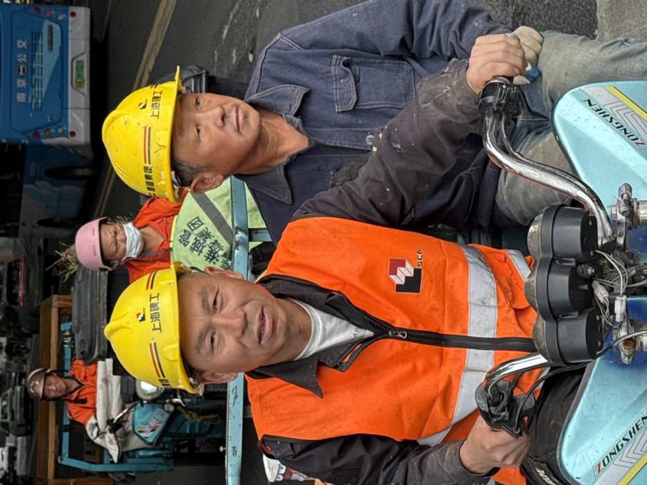 three construction workers on electric tricycles, two in the foreground. One wears an orange safety vest with the "SCG Group" logo and a yellow hard hat that reads "Shanghai Construction Engineering Group." The other wears a denim jacket and also a yellow hard hat. A bus is visible in the background, marked "Nanjing Public Transport." The tricycles are labeled "Zongshen" and "Shanghai Construction Engineering Group." Another worker with a pink hard hat and a mask can be seen between the two main subjects.