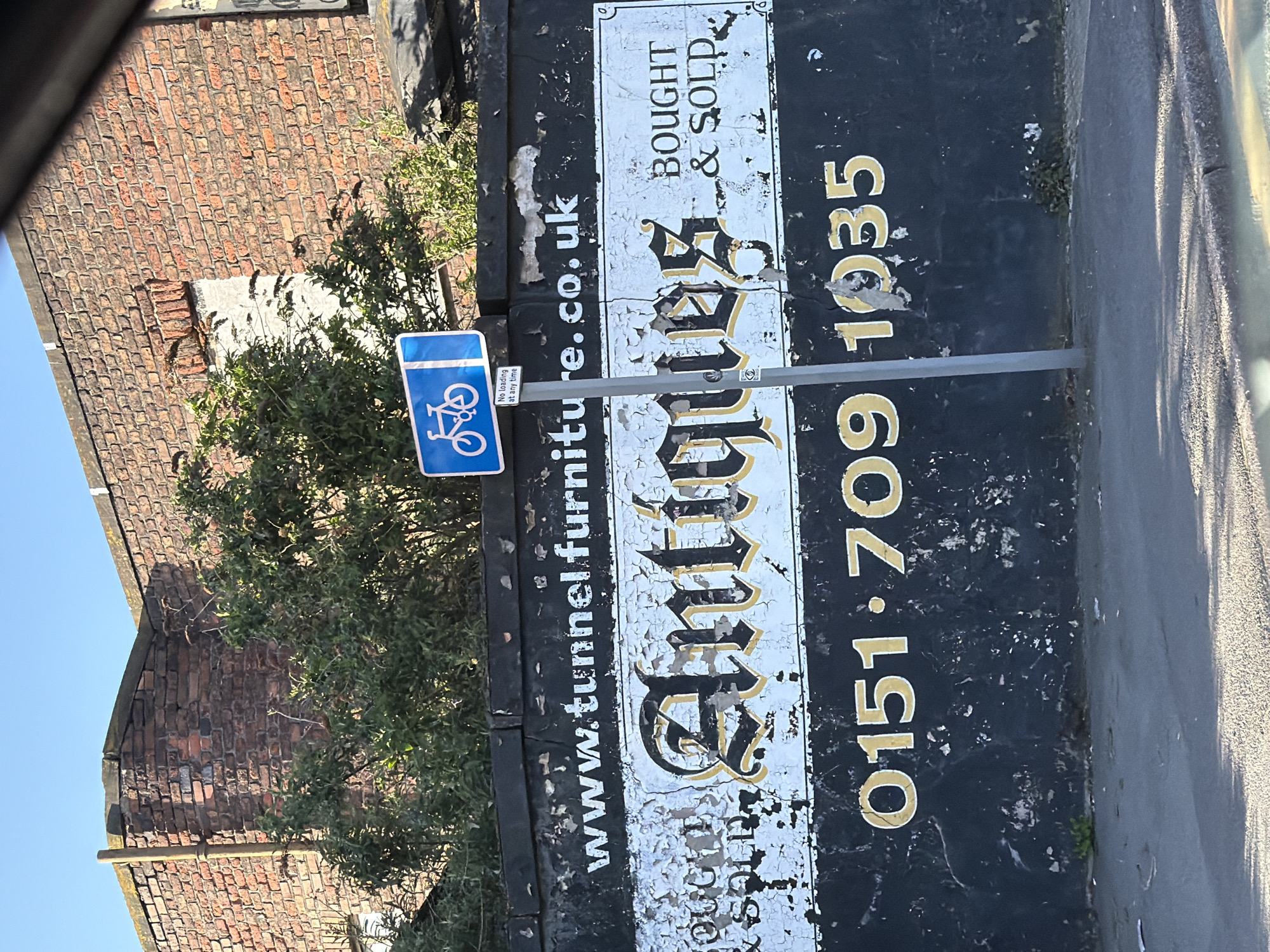 The image captures an outdoor scene, likely in Liverpool, United Kingdom. The dominant element is a weathered commercial sign attached to a brick building. The sign reads: "www.tunnelfurniture.co.uk" and "BOUGHT & SOLD" with the word "Tunnel" in a stylized, ornate typeface. The phone number "0151.709.1035" is also displayed. The sign shows significant wear and tear, with peeling paint and deterioration. A blue bicycle sign is affixed to a pole near the commercial sign. The sign is partially obscured by foliage from a shrub or small tree. The backdrop is a red brick building. The image is taken from a slightly elevated perspective.