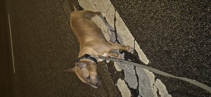 - "A brown Bull Terrier dog lies on a cracked white crosswalk on a wet, dark asphalt road" by FM-Grq9g2, licensed under CC BY 4.0