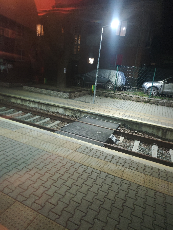 This image presents a static, nighttime view of a train station platform and tracks in Svoge, Bulgaria. In the foreground, a paved platform constructed with grey interlocking concrete pavers features a parallel strip of beige tactile paving. Directly across from this, two parallel railway tracks with concrete sleepers and gravel ballast are visible. A dark, rectangular crossing surface is positioned between the rails, and to its immediate right, a smaller, dark, rectangular object rests partially against the track. Beyond the tracks, another paved platform, similar in design to the foreground platform, is present. A tall, grey metal lamppost with a bright white light source stands on this distant platform, illuminating the immediate surroundings. To the left of the lamppost, a large tree with dark foliage is situated within a raised concrete planter. Behind the tree and platform, multiple dark buildings are visible, displaying several illuminated windows with warm, yellowish light. To the right of the lamppost, a dark vehicle is parked, largely obscured by a light-colored car cover. Further to the right, behind a dark green metal fence, another light-colored SUV is parked. The sky above is dark, with a faint reddish glow originating from the upper left quadrant of the frame. No people or active elements are observed in the scene.