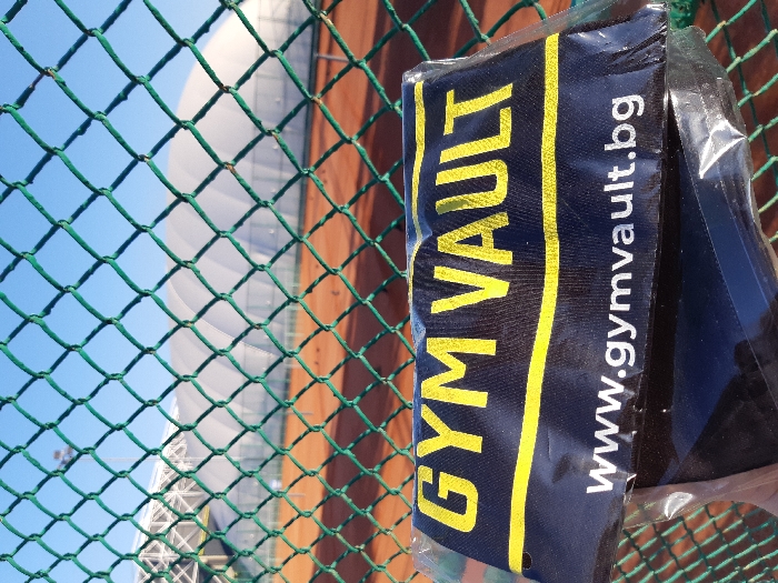 The scene depicts an outdoor sports facility, specifically a tennis complex, under a clear blue sky. In the immediate foreground, a hand holds a black fabric item, likely a wristband or similar accessory, enclosed in clear plastic packaging. The item displays "GYM VAULT" in yellow capital letters, bordered by yellow horizontal lines, with "www.gymvault.bg" in white text beneath. A green chain-link fence, partially blurred, extends across the midground, separating the foreground object from the background. Beyond the fence, a reddish-brown clay tennis court is visible. The background features a prominent, large white inflatable dome structure, commonly an air dome covering tennis courts, with additional architectural structures partially visible to its left. This environment is consistent with the Jerusalem Tennis Center, located in the Katamon neighborhood of Jerusalem, Israel.