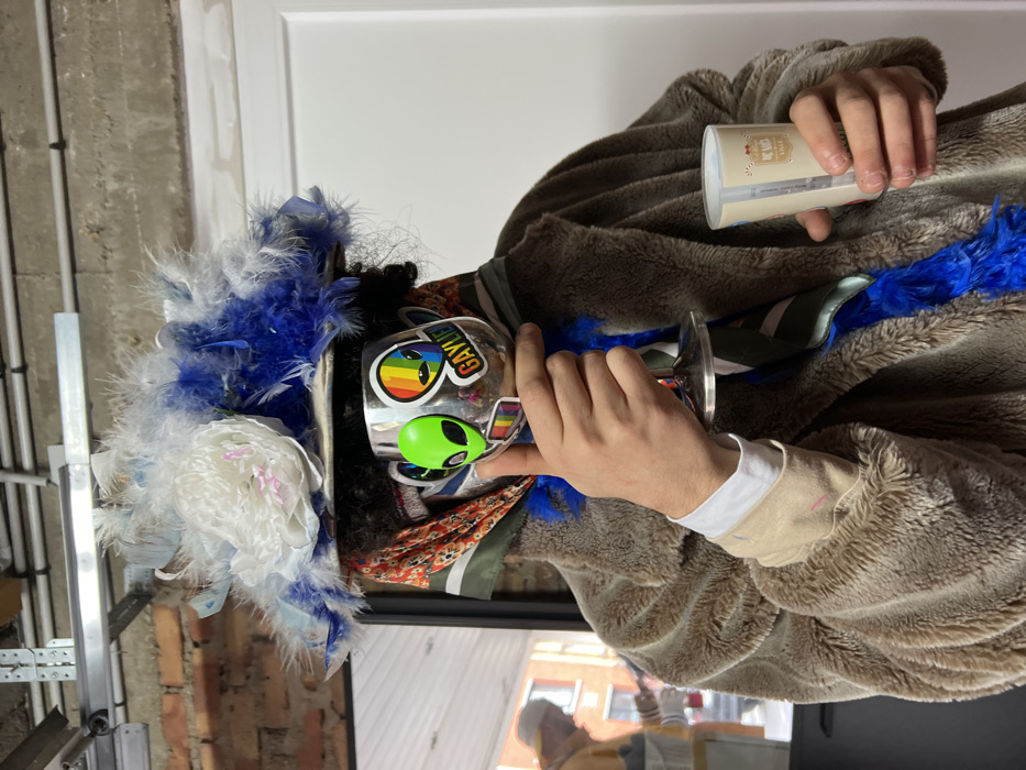 The image depicts a costumed individual in an indoor setting, identified as part of the Dunkirk Carnival in Dunkirk, France. The central subject, whose face is obscured, wears a large, wide-brimmed hat adorned with white and blue feathers and a prominent white artificial flower. Beneath the hat, a multi-colored patterned scarf (orange, green, white) is visible, along with blue feathers around the neck. The main garment is a shaggy, light brown/beige faux fur coat, under which a white collared shirt and beige sleeve cuff are visible. The subject's right hand holds a stemmed wine glass positioned directly in front of the face, concealing it. The glass is decorated with multiple stickers: a bright green alien head, a rainbow-colored alien head, a "GAYLIEN" sticker incorporating rainbow colors, and a partial rainbow stripe. The left hand holds a white cylindrical container, possibly a cup or candle, with a branded label displaying "Le V... VILLE" and festive red imagery. The background on the left features an exposed brick wall and an overhead metallic rail system, likely a garage door track. Through an opening or window on the left, a blurred figure wearing a yellow top and cap is visible, with a brick building and white window frames in the outdoor urban environment beyond. The right side of the background consists of a plain white door or wall section.