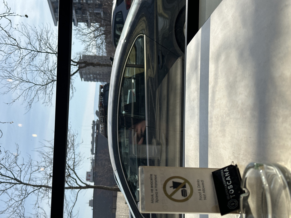 The scene depicts an interior view looking outwards through a large window, providing a street-level perspective in Plovdiv, Bulgaria. The immediate foreground displays a light-colored, possibly concrete, tabletop. On the table, a clear glass ashtray is present next to a white sign in a stand. The sign states "Food & Drinks Not Allowed!" in English and Bulgarian, and includes a black tag identifying the location as "GELATERIA & CAFFETTERIA TOSCANA." This establishment is located at ul. "Kapitan Raycho" 43, 4000 Plovdiv, Bulgaria. Through the window, a dark-colored sedan, appearing to be a Volkswagen Passat CC, occupies the midground, positioned on a street. Reflections on the car's window and the cafe window reveal the hands of an individual holding a smartphone, suggesting the capture point of the image. The background features several bare deciduous trees and various urban buildings, including a light-colored, multi-story structure. Distant hills are visible under a clear blue sky. No explicit human figures or dynamic actions are discernable beyond the reflection of the photographer's hand. The environment is urban, suggesting a clear day with natural light casting shadows.
