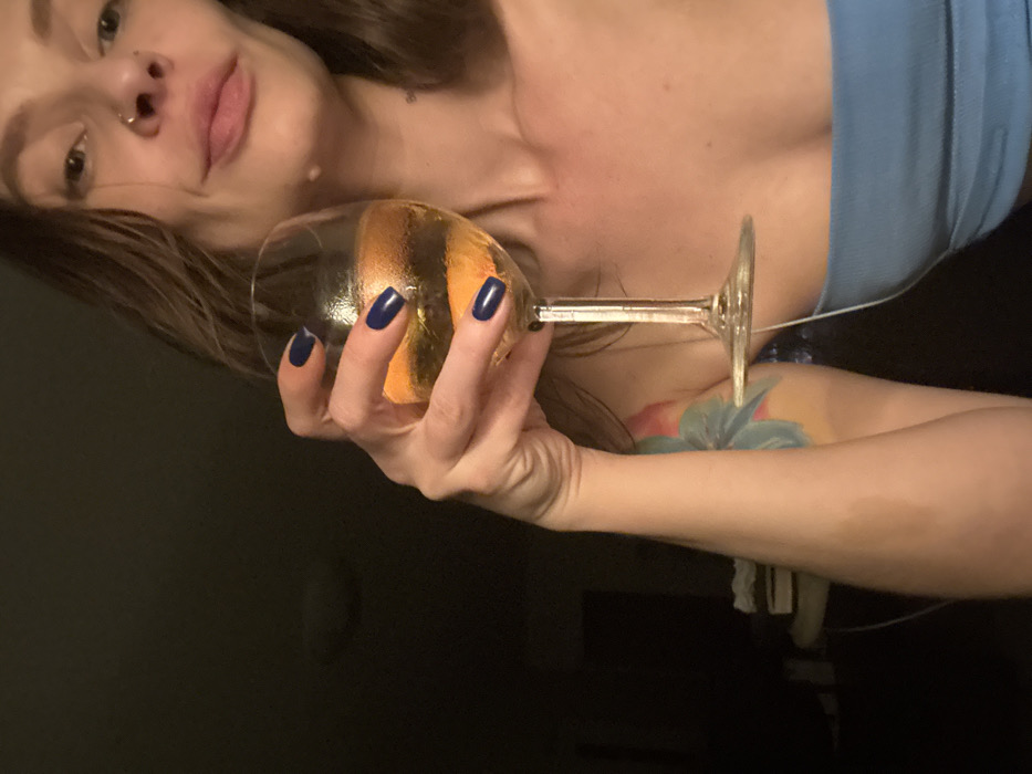 A woman gazes at the camera, holding a wine glass filled with a light-colored liquid. Her fingernails are painted dark blue. She has a nose ring and a blemish on her chest. Part of a blue top is visible, and a colorful tattoo is on her arm. The background is dark and indistinct.