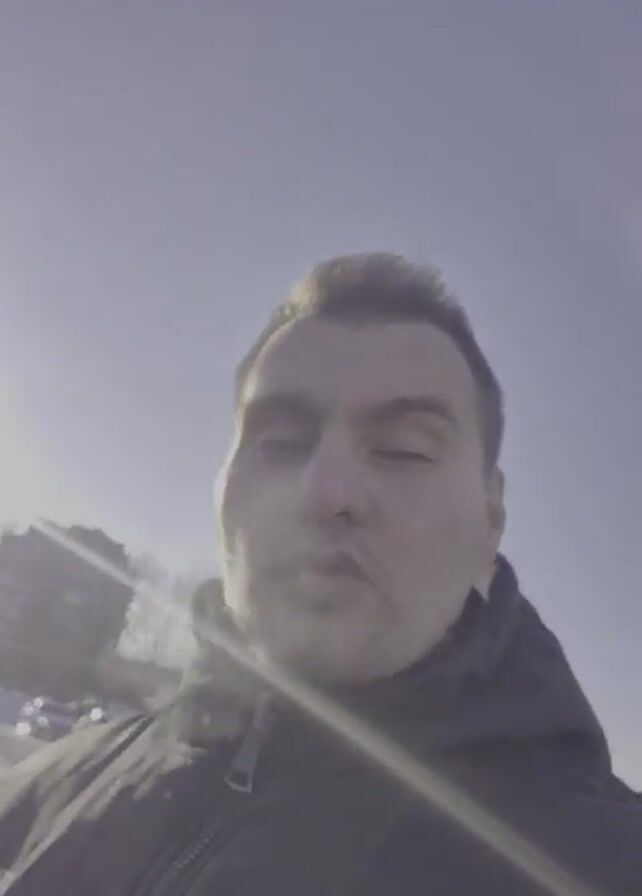 A man in a black jacket with a hood stands outdoors on a sunny day with a few clouds. He is looking directly at the camera and speaking. In the background, there's a parking area with cars and a tall, thin pole. There are also a few signs and possibly a gate structure. The sky is light blue.