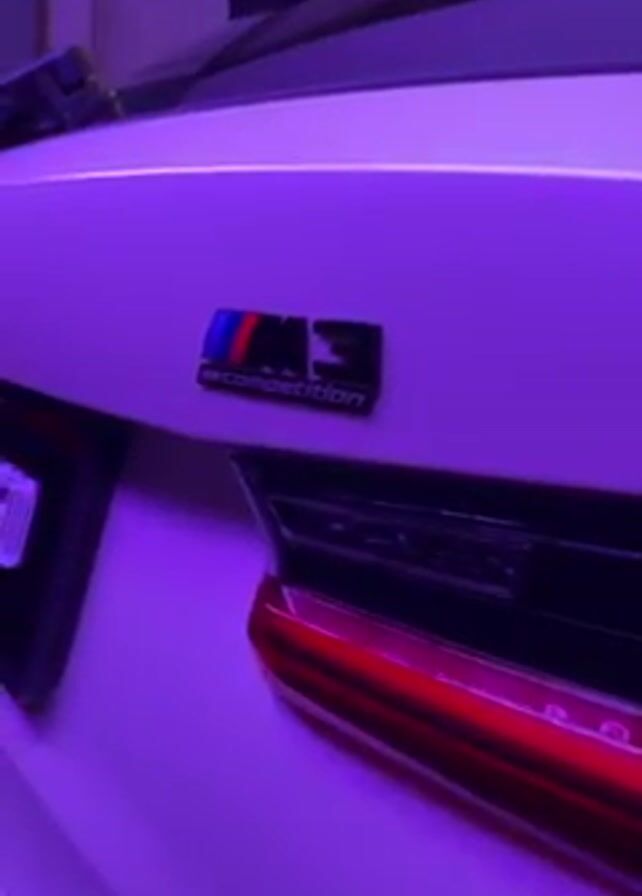rear of a white BMW M3 Competition, illuminated by purple lighting. The M3 Competition badge is visible on the trunk lid. The car's taillights are illuminated with red LEDs. A small portion of a spoiler is visible above the trunk.
