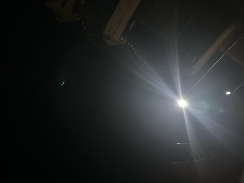 The image captures a night scene with a bright light source dominating the frame. A structure with a chain-like element is visible in the upper portion. A faint, curved object appears in the darkness to the left. The overall impression is dark and dimly lit, with the light creating stark contrast and lens flares.