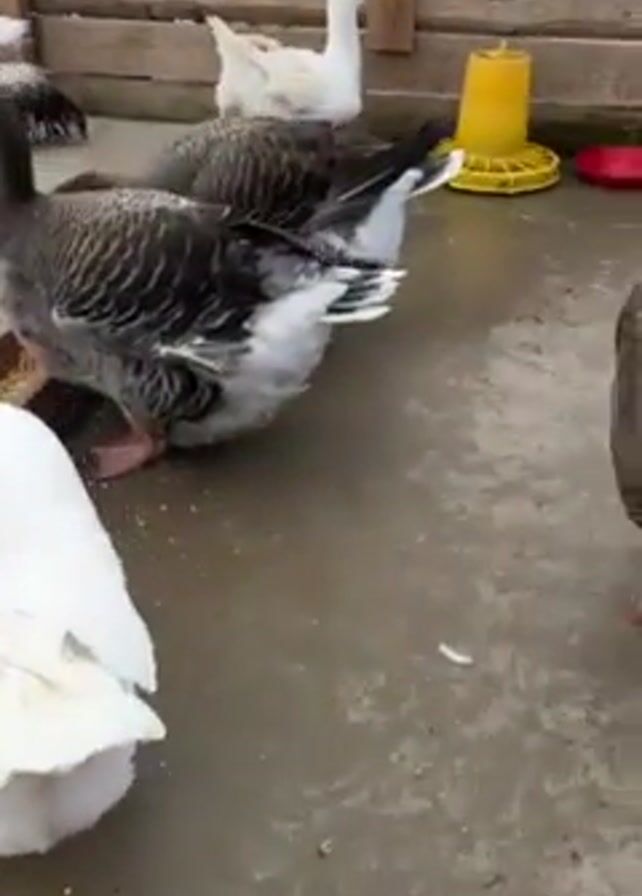 group of geese on a concrete surface. The geese have different coloring. One is white, several are grey with white accents, and one has a light brown and grey pattern. Some of the geese are eating out of a trough of corn, while others are standing around. One goose, grey in color, comes very close to the camera, revealing its pink beak and red eyes. In the background, there is a wooden structure. The video appears to be taken in a farmyard setting.