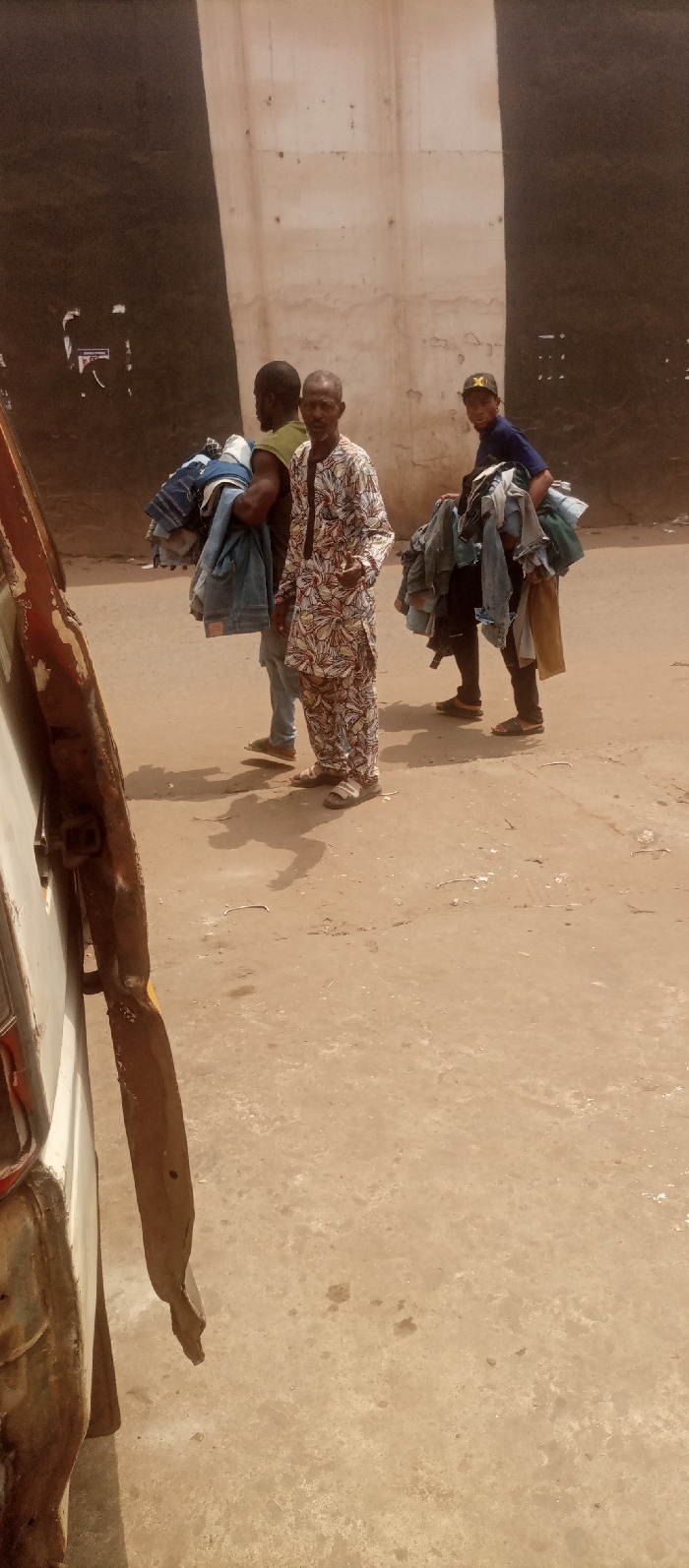 The scene depicts an outdoor urban environment in Nkpor, Nigeria, under bright daylight. In the foreground on the left, a portion of a light-colored, rusted vehicle, possibly a bus or minivan, is visible. Three adult males are present in the mid-ground. The central figure is an adult male with dark skin and a short beard, wearing a full-length, long-sleeved patterned garment in white, brown, and green, and sandals. He faces forward, looking directly at the camera with a slight smile, his right hand partially raised and extended. To his immediate left and slightly behind him, another adult male with dark skin is positioned with his back largely towards the camera. He wears a green sleeveless top and blue jeans, and is carrying a large, haphazard bundle of folded denim and other assorted clothing items over his left shoulder. To the right of the central figure and slightly behind him, a third adult male with dark skin wears a dark blue t-shirt, dark trousers, and a black baseball cap featuring a yellow 'X' symbol. He also wears sandals and looks towards the camera. He carries a substantial, untidy bundle of folded clothing, predominantly denim, over his right shoulder and in his left arm. The ground is a dry, light brown, uneven surface, appearing to be dirt or worn concrete. Shadows cast by the individuals indicate direct sunlight. The background consists of two large, tall walls meeting at an obtuse angle. The wall on the left is dark brown or black with some white markings, while the wall on the right is a lighter, faded concrete color with vertical streaks and discoloration. These structures suggest an underpass or part of a large building.
