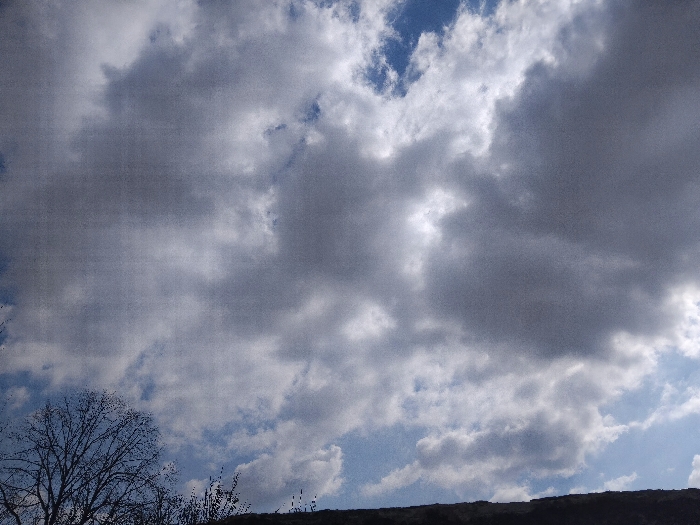 The image depicts a daytime sky over Kameno, Bulgaria, dominated by a fragmented cloud cover. The sky is occupied by a mix of gray and white cumulus and stratocumulus clouds, which vary in density and illumination. Patches of clear blue sky are visible, primarily in the lower right and upper left portions of the frame. Sunlight is partially obscured by the clouds, creating varying degrees of brightness and shadow across the cloud formations. The lower edge of the image features a dark, silhouetted horizon line, representing distant ground or terrain. Sparse, bare deciduous vegetation, including a prominent tree silhouette, is visible along this horizon, particularly in the lower-left quadrant. No individuals, specific actions, or artificial structures are discernible within the frame.