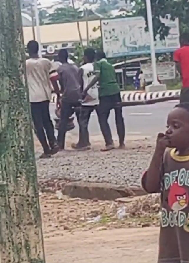 In a mid-shot captured outdoors during daylight, a young boy stands near a tree, observing a group of men across a road. The boy is dressed in a brown shirt featuring an Angry Birds graphic, with multicolored stripes on the sleeves. He initially has his finger in his mouth, then takes it out and holds his hand out to the side. His gaze is directed towards the group of men across the street. The men, five in number, are positioned near a road marked with black and white stripes. One man is wearing a red shirt, another a green shirt, and one a white shirt. They appear to be engaged in some sort of confrontation, with one holding a long stick or pole. The background includes trees, buildings, and a billboard, suggesting an urban or suburban setting. The overall environment seems to be outdoors. The lighting is somewhat muted, indicating either an overcast day or a time of day with softer sunlight.