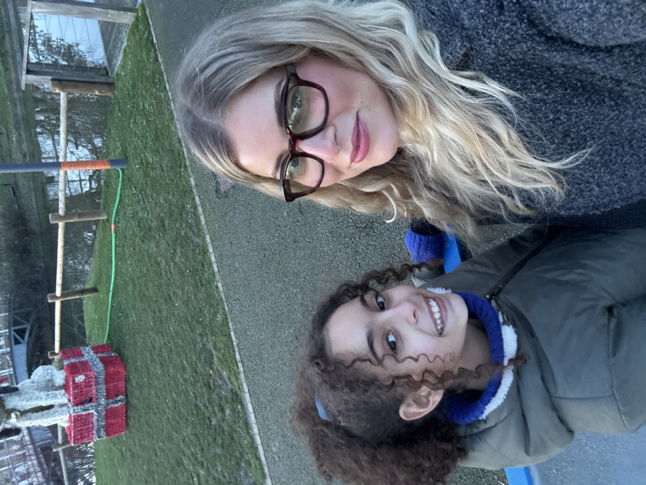 The image captures a selfie of two smiling females outdoors in a park setting within Marcq-en-Barœul, France. On the right, an adult female with blonde wavy hair wears brown-rimmed glasses and a grey textured coat, smiling subtly at the camera. On the left, a child with dark curly hair tied back in a ponytail wears a khaki puffer jacket with a blue and white striped collar, smiling broadly and looking directly at the camera. In the background, a large white decorative animal figure, possibly a dog or sheep, sits atop a red gift box, indicating a festive display. This decoration rests on a grassy area, beyond which a calm body of water is visible. The water's edge is delineated by wooden posts, and a metal bridge spans the water further in the distance. A grey paved path runs across the foreground, separating the subjects from the grassy area and water. A green hose lies on the grass near the water's edge. The lighting suggests daylight conditions, possibly late afternoon.