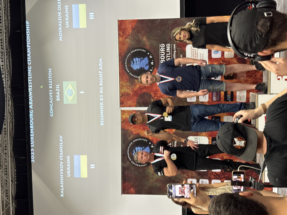 - "podium for the Beginner 85 KG Right Arm category at the 2025 Luxembourg Armwrestling Championship" by FM-IL2Dl2, licensed under CC BY 4.0