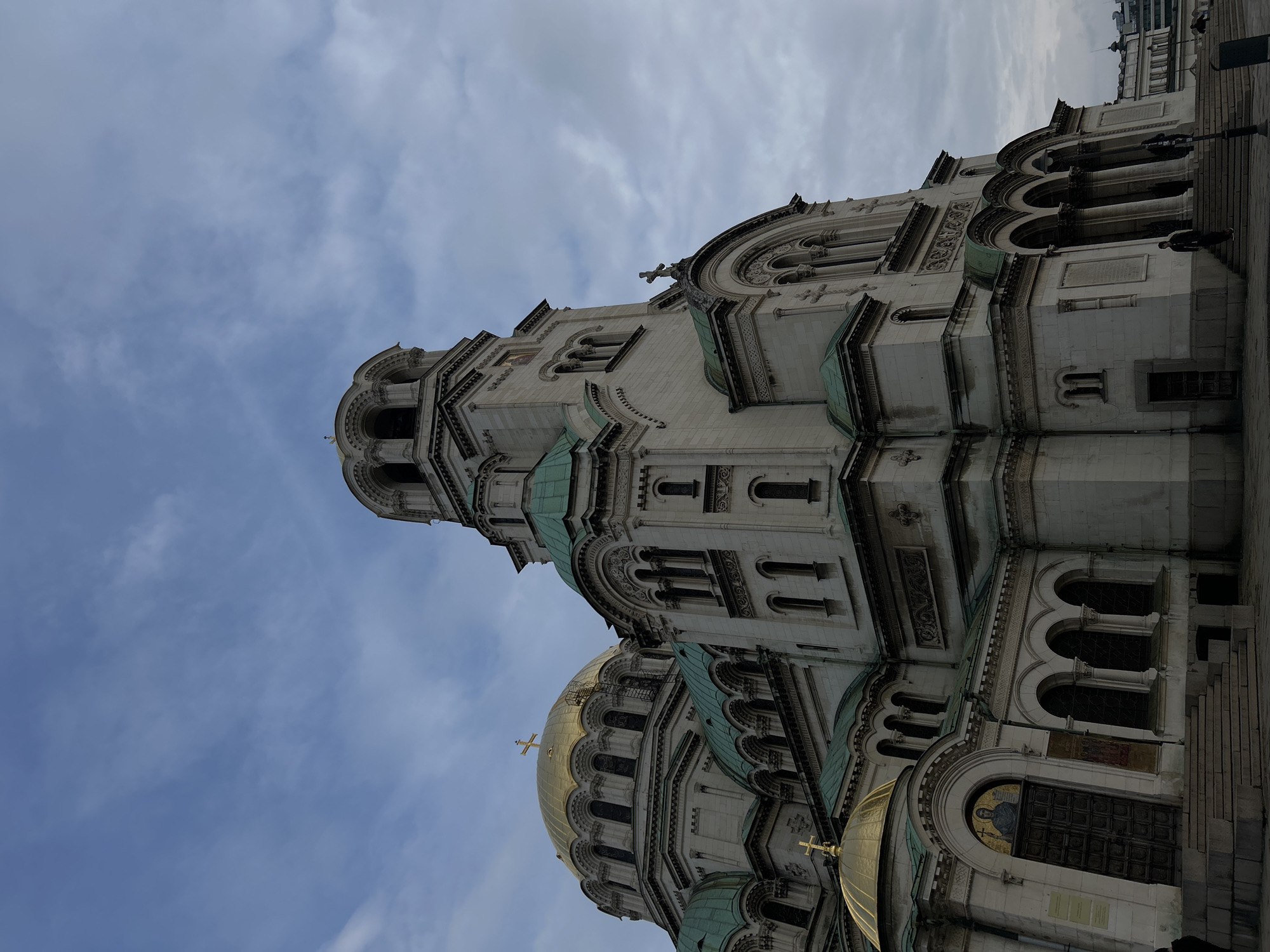 Alexander Nevsky Cathedral in Sofia, Bulgaria, photographed from a low angle, emphasizing the architectural details of the building