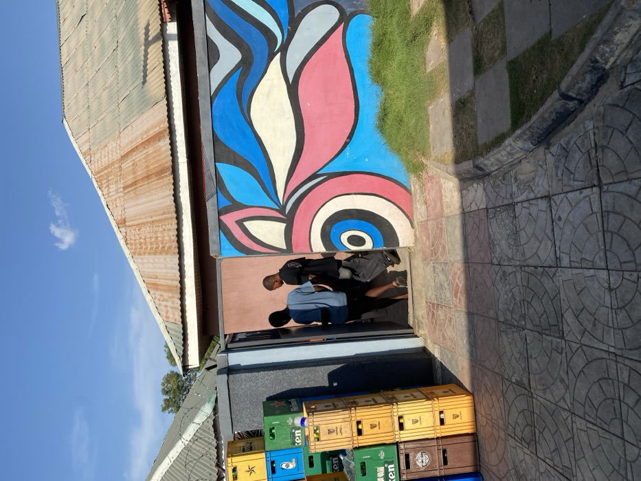 The image captures an outdoor scene in Adankolo, Nigeria, at what appears to be an entrance to a building. Two male individuals are observed walking into a doorway, seen from behind. The individual on the left wears a light blue short-sleeved shirt and dark trousers, while the individual on the right wears a black short-sleeved shirt and dark trousers. The doorway is flanked by a dark gray wall on the left and a wall painted with a colorful, abstract mural on the right. The mural features sweeping patterns in pink, various shades of blue, white, black, red, and gray. To the left of the doorway, a stack of plastic beverage crates is positioned. These crates are primarily green (with "Heineken" visible), yellow/brown (with "Guinness" visible), and some blue and yellow crates displaying a star logo. Some crates appear to contain bottles. The ground in the foreground consists of paved tiles with distinct circular and square patterns. A low curb separates the paved area from a small patch of green grass to the right, directly adjacent to the mural wall. In the background, under a clear blue sky with a single small white cloud, two buildings are visible, each topped with a rusty, corrugated metal roof. Barbed wire is installed along the upper section of the wall belonging to the building on the far left. Shadows cast by the structures and individuals indicate direct sunlight.