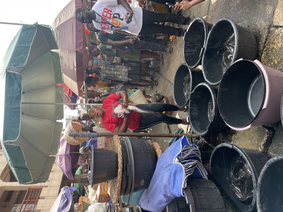 The image depicts a bustling outdoor market scene in Ebute-Metta, Nigeria, under daylight conditions