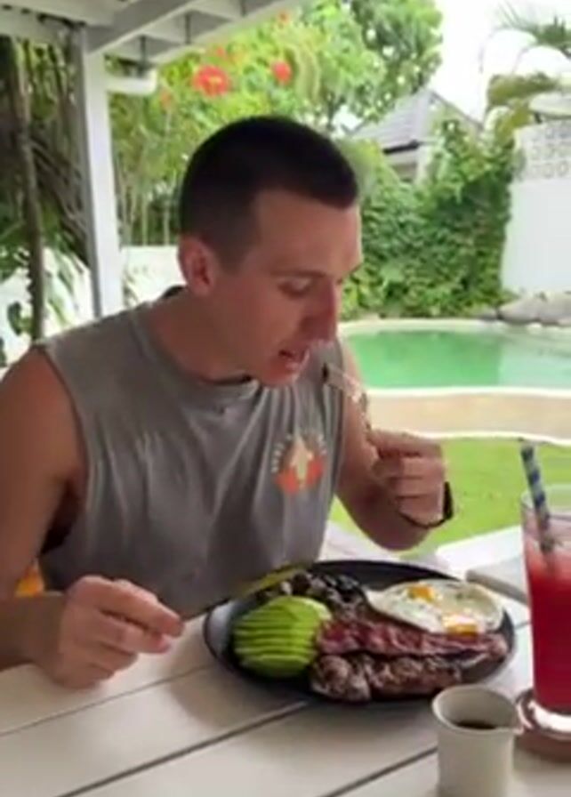 A man is enjoying breakfast outdoors at a table, beside a pool. The table, white with a slatted pattern, holds a black plate piled with food: avocado slices, mushrooms, bacon, and a fried egg. A small white cup of coffee sits next to the plate. To the side is a tall glass of red liquid, garnished with watermelon and a straw. A yellow flower and a menu add to the setting. The man wears a gray tank top and a watch. He uses a fork and knife to eat. Behind him, a pool shimmers, surrounded by green grass, various plants, and a white fence adorned with greenery. The scene is bright and airy. The camera pans slightly to showcase the pool and the surrounding landscape.