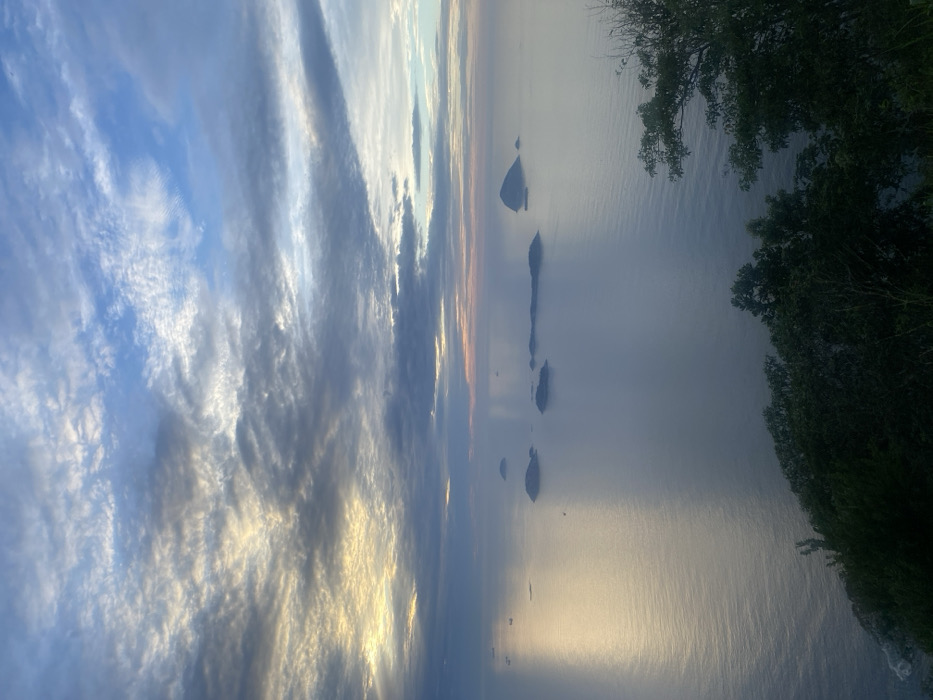This image depicts an expansive elevated view of the Atlantic Ocean, observed from a high vantage point along the coast of Rio de Janeiro, Brazil, specifically capturing the Ilhas Cagarras archipelago. The sky, comprising the upper half of the frame, displays a mix of stratocumulus and cirrus clouds. These clouds are illuminated by low-angle sunlight, casting golden and soft orange hues on the left side, gradually transitioning into shades of blue and gray towards the right. The calm ocean surface occupies the middle ground, reflecting the sky's colors and featuring a prominent, elongated vertical golden light reflection on its left side, indicating the sun's low position to the left of the frame. Several rocky, vegetated islands, identifiable as the Ilhas Cagarras, are scattered across the water. A distinct, conical-shaped island is visible towards the mid-right, while a cluster of smaller, elongated islands lies to its left. On the far left horizon, faint silhouettes of multiple large ships are discernible. The immediate foreground, approximately the bottom 10% of the image, consists of dark green, dense tree canopy, indicating the observation point is from a vegetated clifftop or mountain slope overlooking the sea. No human figures, specific actions, or interactions are visible within the scene.