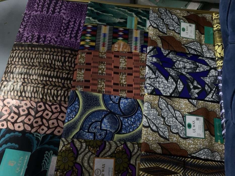 The image displays a colorful assortment of African wax print fabrics