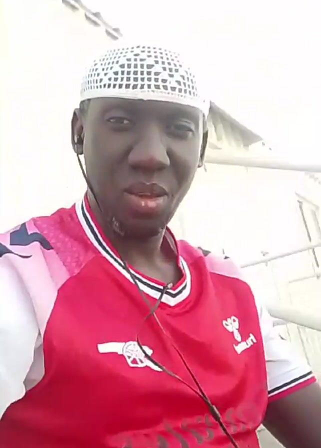 A man wearing a white Muslim prayer cap and a red and pink Arsenal soccer jersey is filming a video