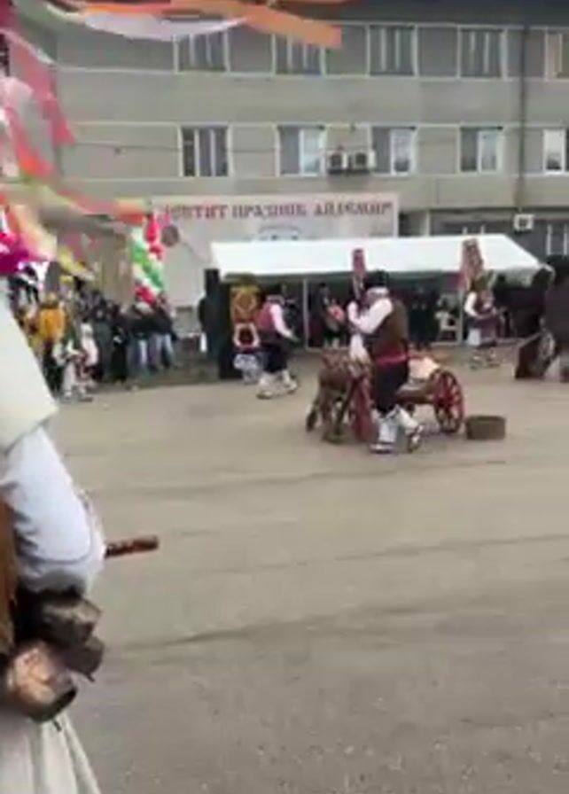festival scene in a town square, with people in traditional folk costumes and masks