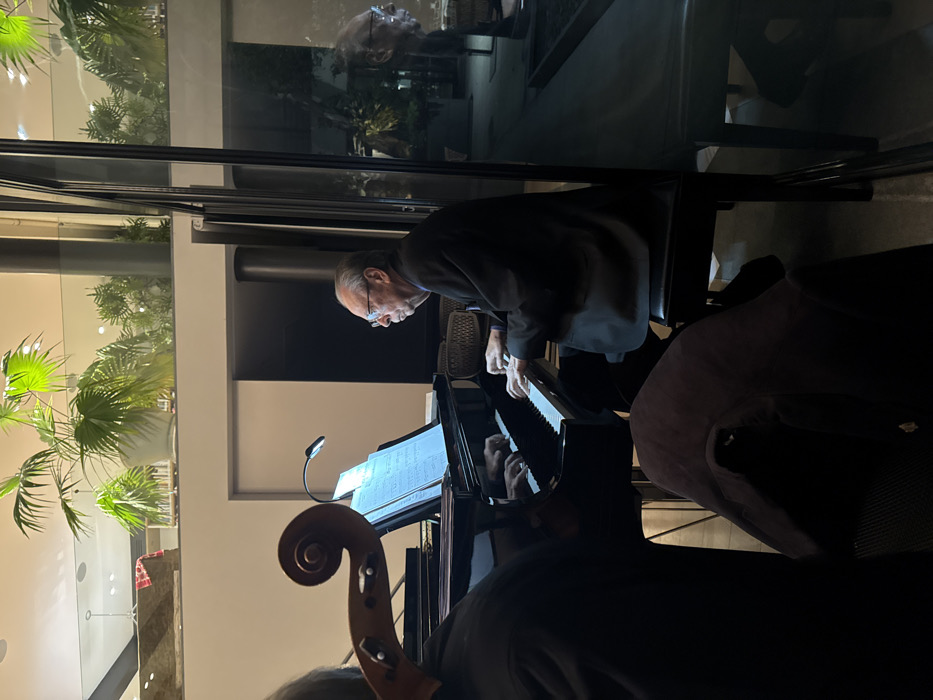 An elderly male, wearing a dark suit and glasses, is seated and actively playing a black grand piano within an upscale indoor venue in Mexico City, Mexico. His hands are visible on the piano keys, and sheet music is open on the piano's stand, illuminated by a clip-on lamp. To his left, partially in the foreground, the scroll and upper body of a dark string instrument, possibly a cello or double bass, is visible, indicating the presence of another musician or instrument. A dark jacket is draped over a chair in the immediate foreground. The environment features modern interior architecture with light-colored walls, recessed lighting, and a mezzanine level with potted palm-like plants behind a glass railing. Large glass panels on the right reflect the pianist and the indoor plants, suggesting an exterior view or another indoor section, with the reflection indicating low light outside, possibly evening or night. Woven-back chairs are visible behind the pianist.