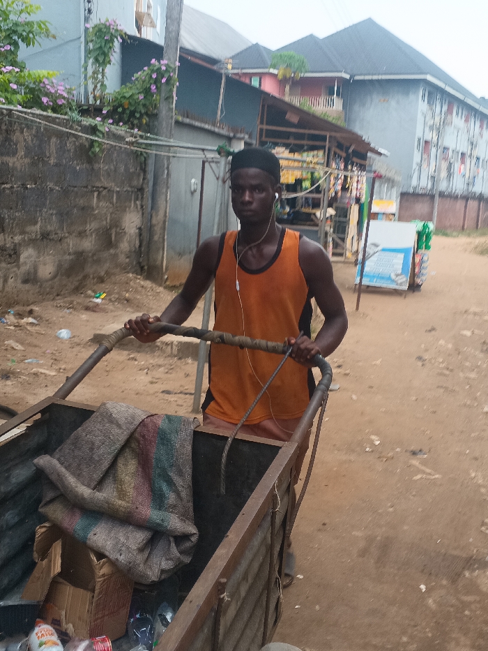 A young man wearing an orange tank top and a black cap pulls a metal cart down a dirt road. He has earbuds in and a serious expression. The cart is filled with trash and covered with a blanket. Behind him are buildings, a small shop with goods on display, and a street. The surrounding area is littered with trash, suggesting a low-income or neglected neighborhood.