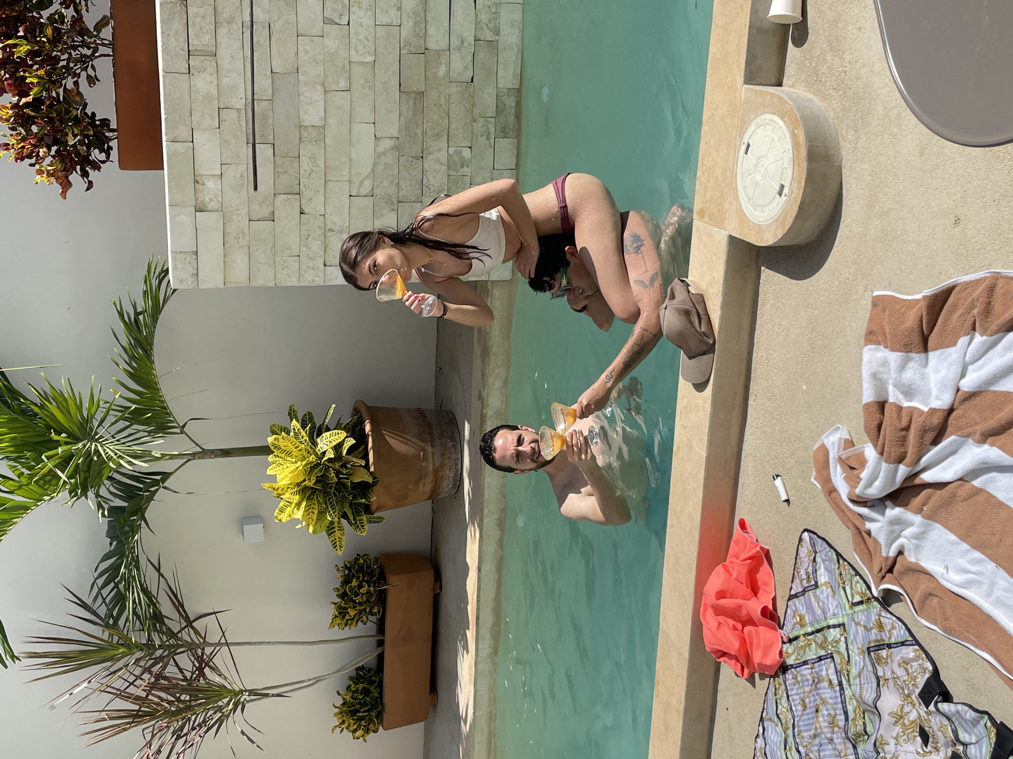 A couple is in a swimming pool at an outdoor location in Brisas de Zicatela, Mexico. The woman, wearing a white bikini top and maroon bottoms, is sitting on the man's shoulders. Both are holding glasses with yellow liquid, possibly cocktails. The man is shirtless. Near the pool, there's a striped towel, a red piece of clothing, and a patterned scarf on the concrete patio. The patio is bordered by a white textured wall with potted plants. The scene is illuminated by natural sunlight.