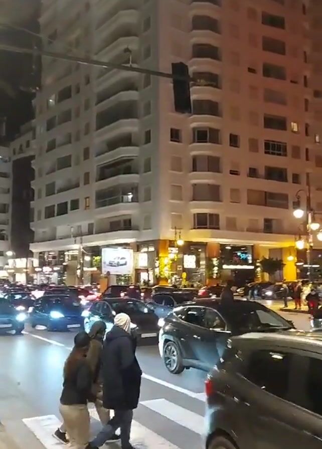 The video captures a bustling city street at night, featuring a large white building with multiple balconies towering over the scene