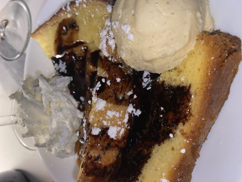 The image presents a high-angle, close-up view of a plated dessert, observed within an indoor dining setting, specifically identified as being in Cucuron, France. The dessert rests on a white, circular ceramic plate. The primary components include two substantial slices of a light-colored, golden-brown cake or bread, possibly pound cake or brioche. Centrally located on top of these slices is a rectangular item with a distinctive grid pattern, resembling a waffle or French toast, thoroughly drenched in a glossy, dark brown liquid, consistent with chocolate syrup. A large, irregularly mounded dollop of white whipped cream is positioned towards the upper left side of the plate. To the right, a scoop of pale yellow ice cream, displaying minute dark speckles, suggestive of vanilla bean, rests against one of the cake slices. A fine dusting of white powdered sugar is scattered over the chocolate-covered waffle-like item and the cake slices. In the blurred background, the upper portions of clear glass stemware are visible, indicating the presence of at least two drinking glasses on a light-colored surface. No individuals are present in the scene, which is static.