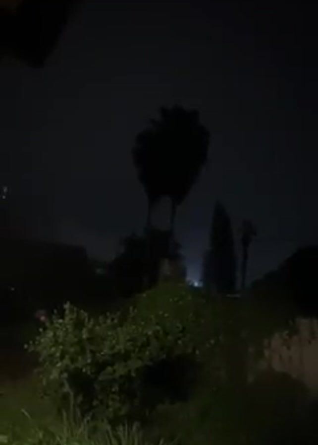 dark, rainy night scene with trees and greenery in the foreground. Occasional flashes of lightning illuminate the scene, revealing palm trees and other vegetation. The footage is taken from a slightly elevated perspective, possibly under a porch or awning, as evidenced by a dark structural element at the top of the frame.