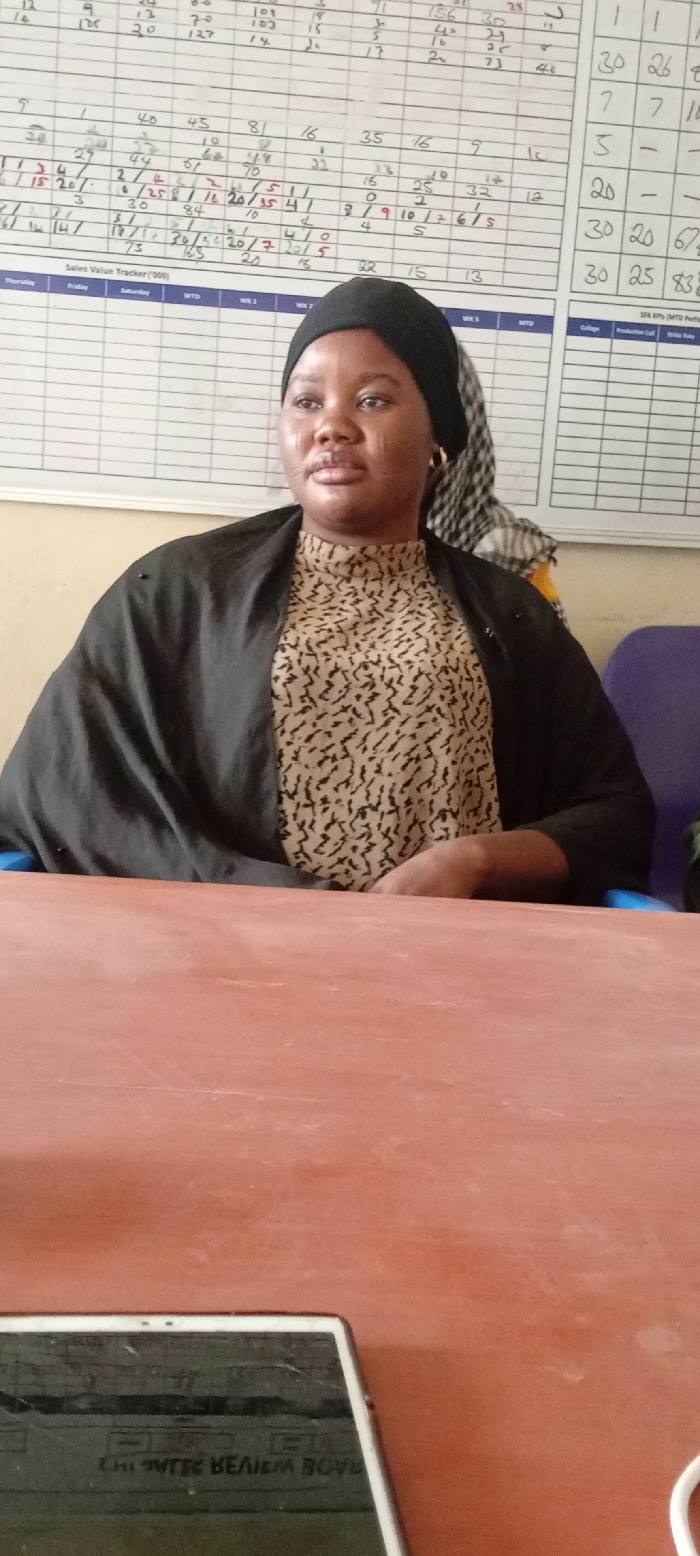 An adult female is depicted seated at a reddish-brown table within an indoor setting in Fagge A, Nigeria