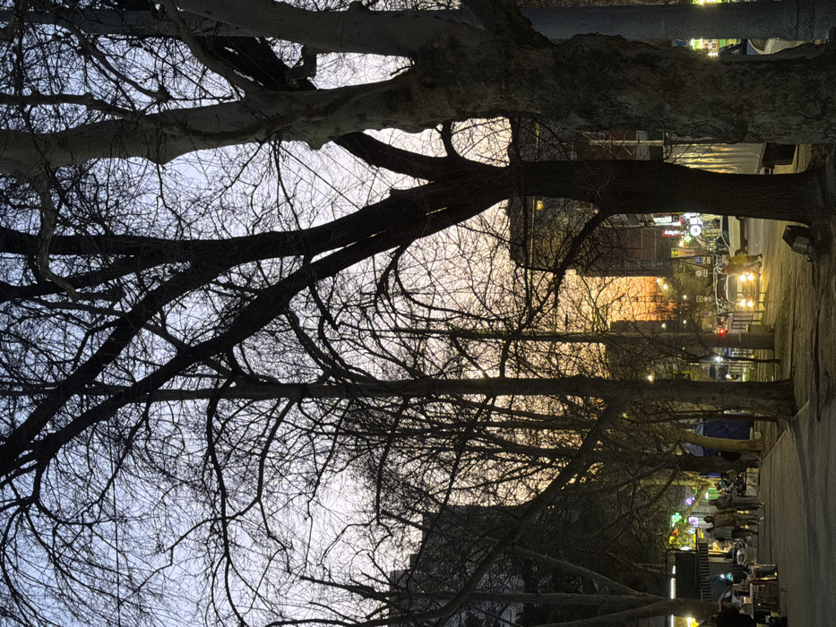 An urban street in Krasnodar, Russia, is depicted during dusk or early evening. The sky displays a gradient from light blue overhead to orange and yellow at the horizon. Numerous bare deciduous trees, devoid of foliage, form a prominent silhouette across the scene, indicating a cold season. On the left, a paved sidewalk hosts approximately seven pedestrians walking or standing. Several illuminated market stalls or kiosks are situated along this path. A roadway occupies the right midground, separated from the sidewalk by pedestrian barriers. Multiple vehicles, including cars and a white van, are present on the road; one car's headlights are active. A person wearing yellow stands near the roadway, appearing to interact with a vehicle. Multi-story buildings with illuminated windows and various commercial signs, some in Cyrillic, constitute the background. Streetlights provide artificial illumination to the street.
