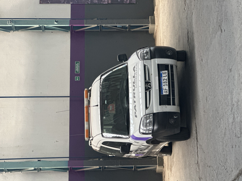 A white Peugeot Partner van, marked as a "PATRULLA URBANA" (Urban Patrol) vehicle, is parked indoors or under a large covered structure in Quilmes Oeste, Argentina