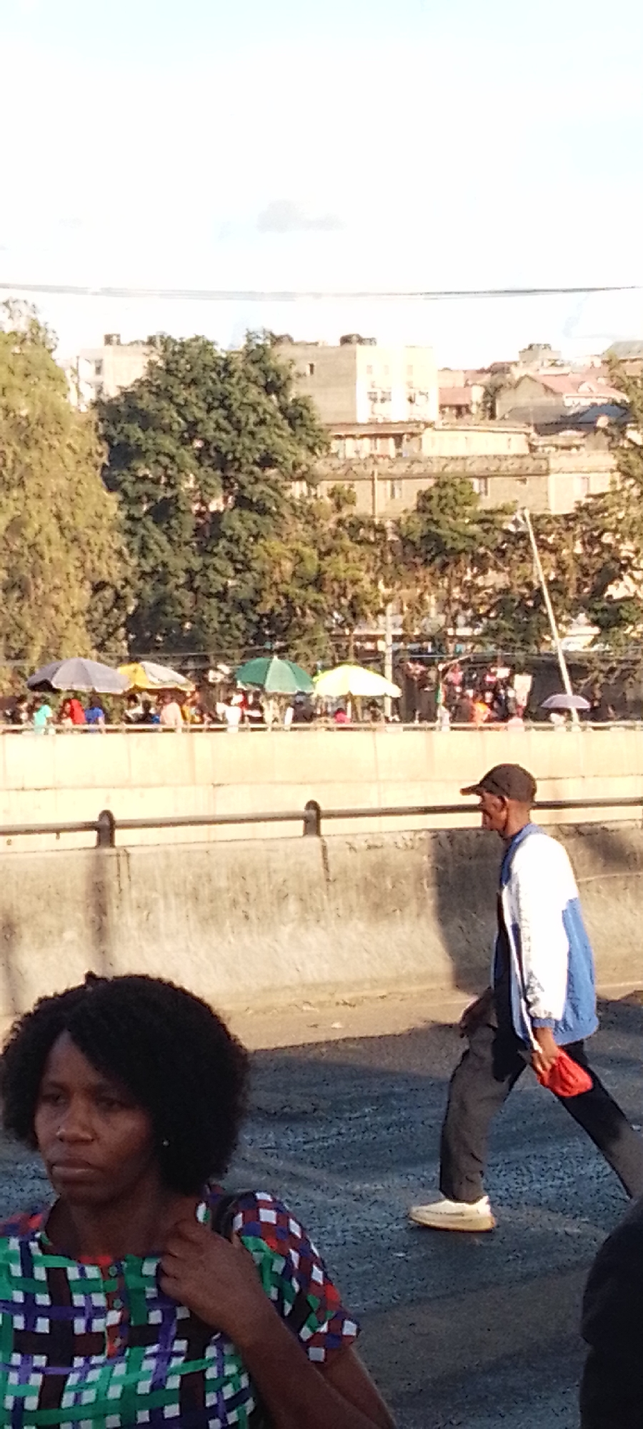 Here is a description of the image. The image shows a street scene in Nairobi, Kenya. A concrete barrier with metal railings runs across the middle of the frame, with trees, buildings, and a gathering of people underneath umbrellas visible in the background. In the foreground, a woman with dark curly hair, wearing a colorful patterned shirt, stands with her hand near her chest. To her right and slightly behind, a man wearing a baseball cap, a white jacket with blue sleeves, black pants, and light-colored shoes walks to the right, holding a red bag. The ground appears to be a dark, possibly paved surface with some texture. The lighting suggests it is daytime.