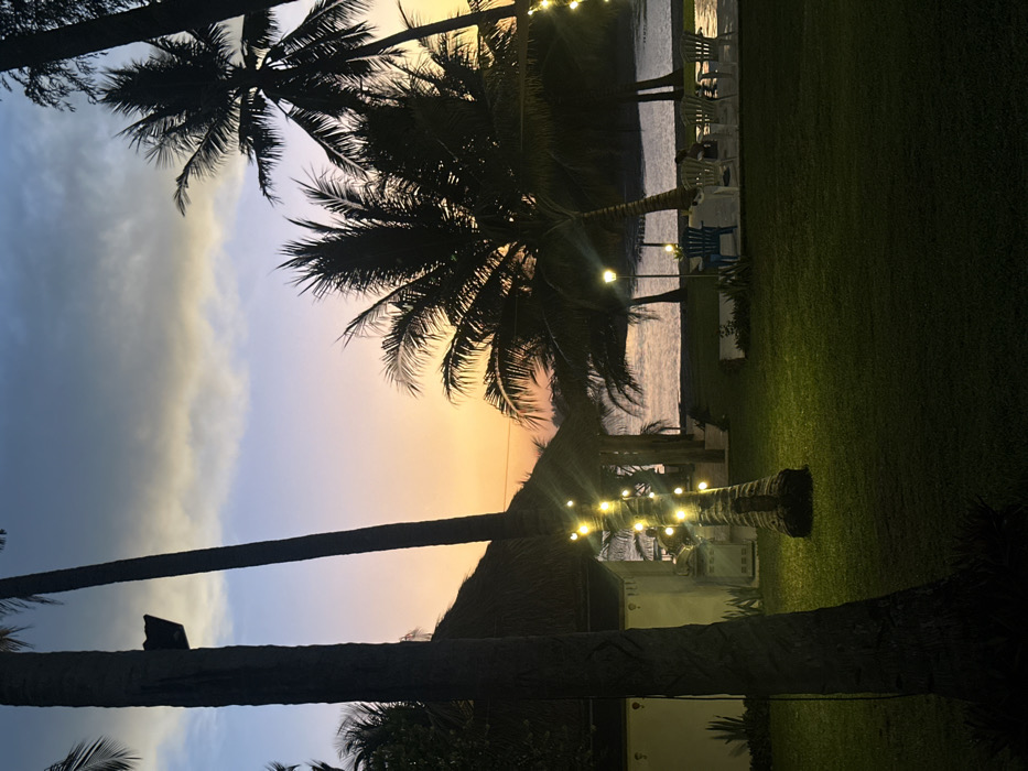 Palm trees frame a beachfront sunset scene. The sky blends from blue to orange. String lights adorn palm trees on a grassy area, where tables and chairs are arranged, possibly for an event. The ocean is visible in the background between the palms. A nipa hut-style structure adds a tropical feel.