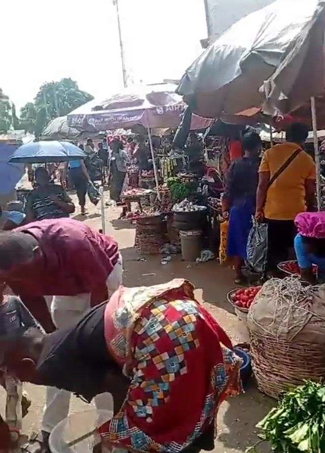 busy outdoor market scene. People are walking around, browsing stalls under awnings that offer shade. Several individuals are bent over, inspecting or purchasing goods, including produce like tomatoes and leafy greens. A man in a maroon shirt and light-colored pants appears to be interacting with people near a stall. A few children are also present. The market environment includes various containers, baskets, and bags holding items for sale. The overall atmosphere is bustling, with a mix of vendors and customers engaged in commerce.