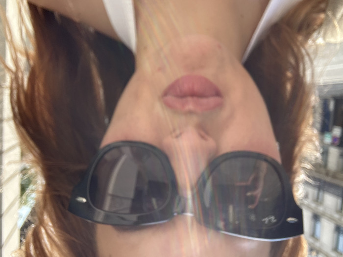 A close-up, selfie-style image depicts an individual outdoors in Paris, France, captured from the chest upwards. The subject, identifiable by reddish-brown hair and light skin, is wearing black Wayfarer-style Ray-Ban sunglasses, with the brand logo visible on the left lens. A reflection of a hand holding a smartphone is distinctly visible on the left sunglass lens, indicating the self-portrait nature of the image. The subject's mouth is pursed in a prominent pouting expression. A white garment is visible around the neck and chest. The blurred background features classic Parisian Haussmannian architecture, characterized by light-colored stone buildings with multiple stories and visible wrought-iron balconies. Strong sunlight illuminates the scene, causing significant lens flares centrally across the subject's face and sunglasses. Green foliage is faintly discernible on the right side of the frame.