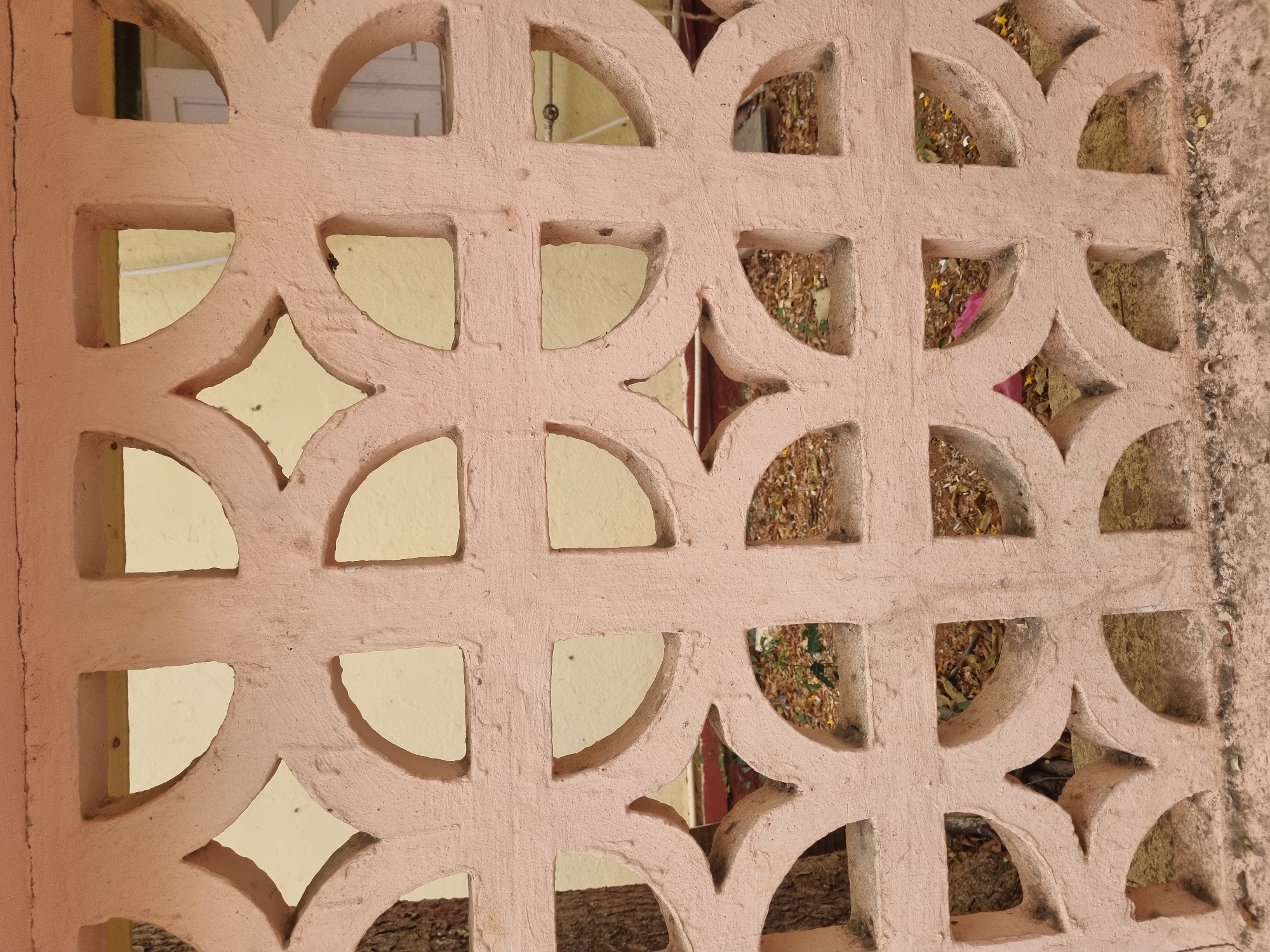 This image displays a section of a light pink, weathered concrete screen or wall, located in Puttaparthi, India