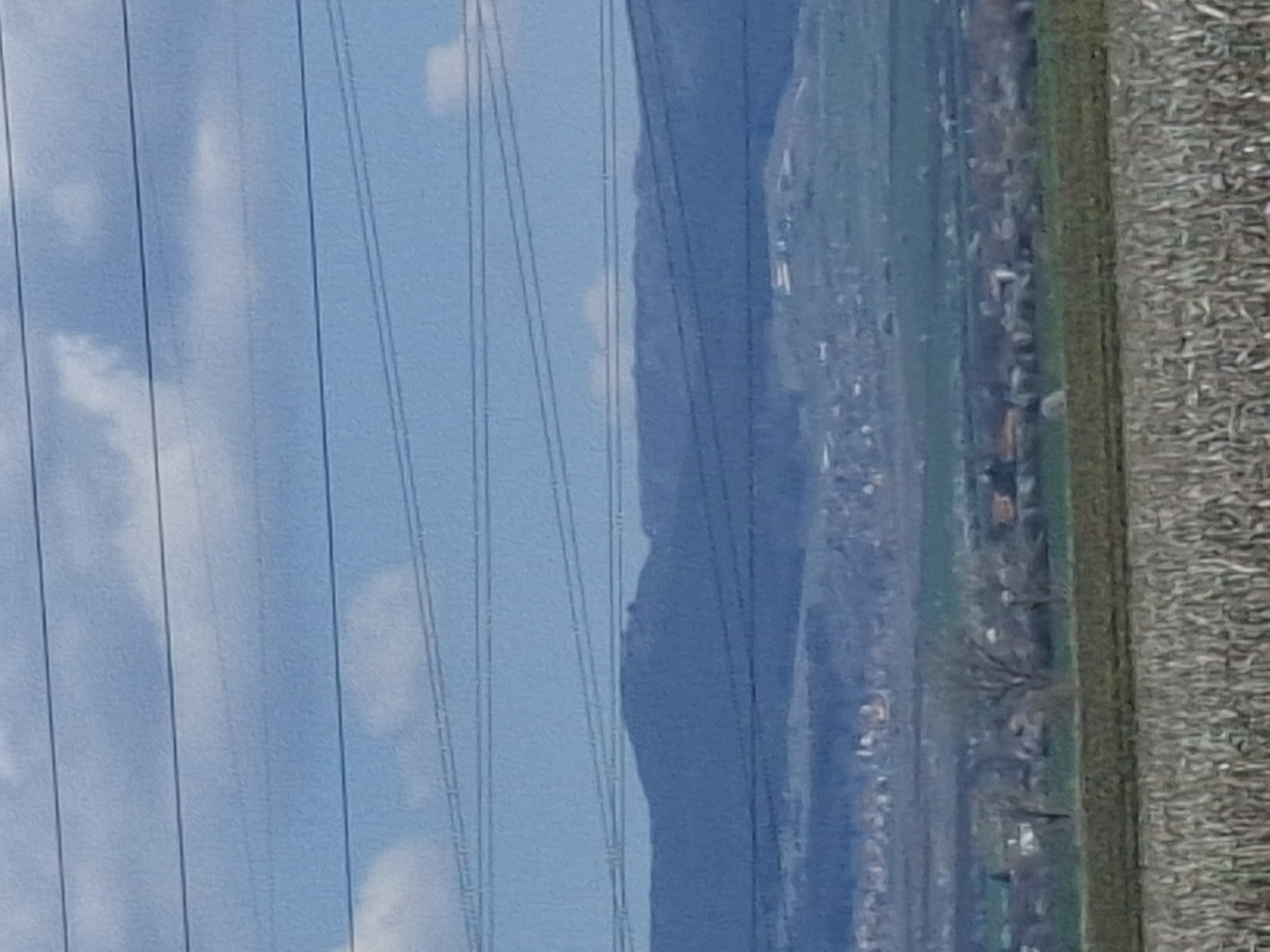 rural landscape in Mramor, Bulgaria. Power lines stretch across a blue sky with scattered clouds. A mountain range forms the midground. A town nestles at the foot of the mountains. The right side of the frame is dominated by a field.