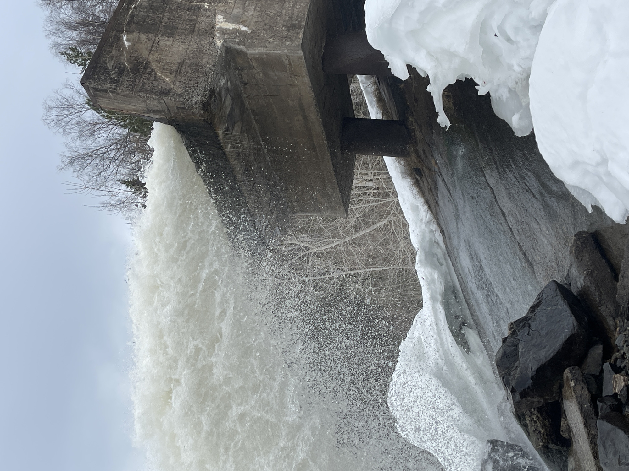 large volume of water cascading from a concrete structure, likely a dam or similar water control feature