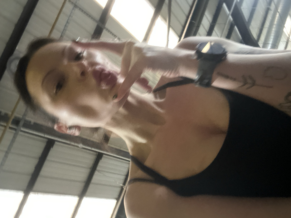 A blurred, high-angle selfie captures a fair-skinned female subject with dark hair pulled back, directly facing the camera. She performs a "duck face" with puckered lips and her tongue extended. Her right hand is raised, making a V-sign gesture, with dark-painted fingernails visible. She wears a black tank top or sports bra. A dark-colored wristwatch is on her left wrist, and minimalist line-art tattoos, including an arrow and abstract shapes, are visible on her left forearm. A small earbud is in her left ear. The background shows a high, possibly industrial or gym ceiling with corrugated metal panels and exposed structural elements. Several bright rectangular light sources, likely skylights or windows, illuminate the scene. The specific location within the city of Tonbridge and Malling, United Kingdom, cannot be determined from the visual evidence provided.