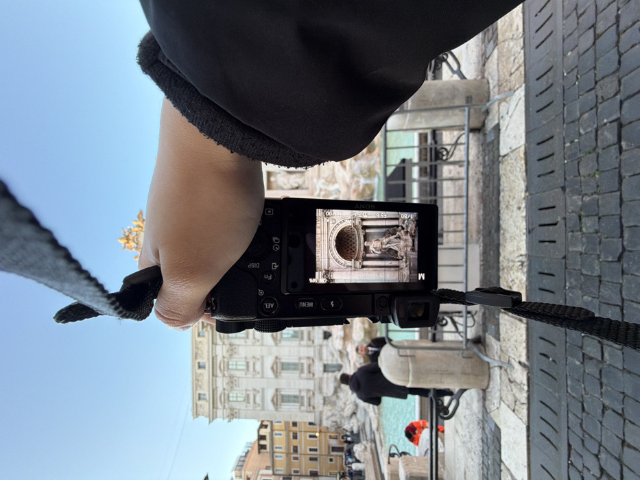 - "A person holds a black Sony camera, its screen displaying a shot of the Trevi Fountain's architecture and sculpture" by FM-7gWCF3, licensed under CC BY 4.0