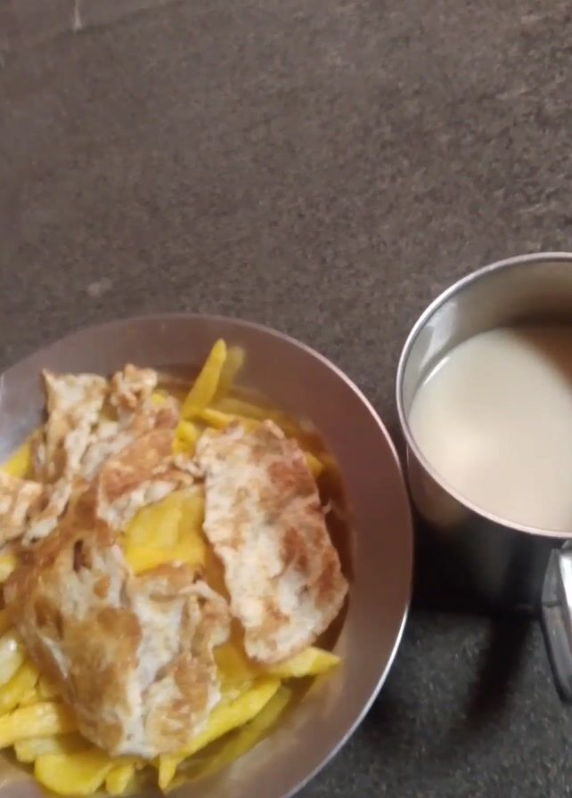 - "A plate of fried potatoes topped with scrambled eggs sits on a gray carpet beside a metal cup filled with a light-colored liquid" by FM-DkTv82, licensed under CC BY 4.0