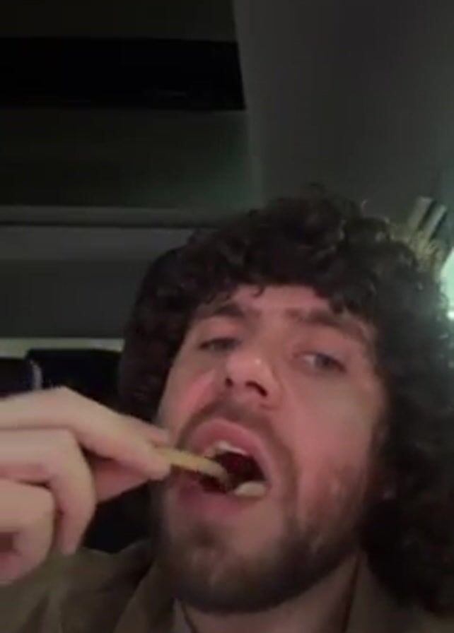 A man with curly hair and a beard is in a car, and he is eating a french fry